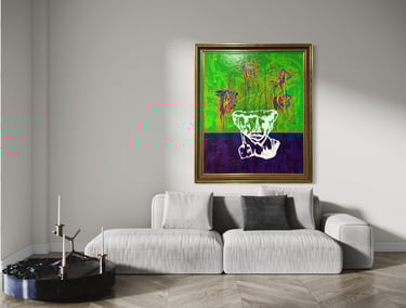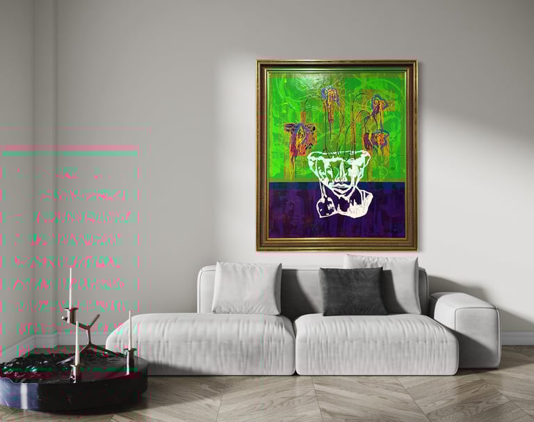 The painting "Insomnia" with the subtitle "Something in My Head" illustrates the internal conflicts and unrest that arise during the night. The division between toxic green and gloomy violet creates a haunting atmosphere, reflecting insomnia. In the center of the painting, there is a half-destroyed facial sculpture, which also represents a vase. Four metallic shimmering flowers in the vase symbolize various facets of the human mind, from beauty to fragility.