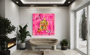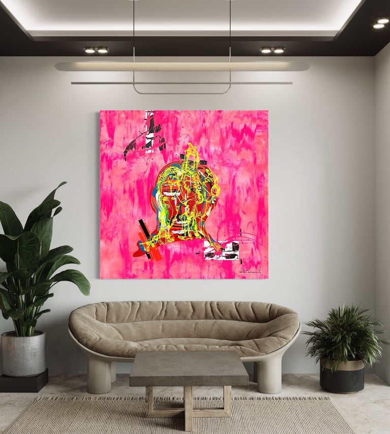 Is a mesmerizing masterpiece that captivates with its vibrant pink background and striking imagery. Amidst the lively backdrop, abstract squares in white and black add depth and mystery.